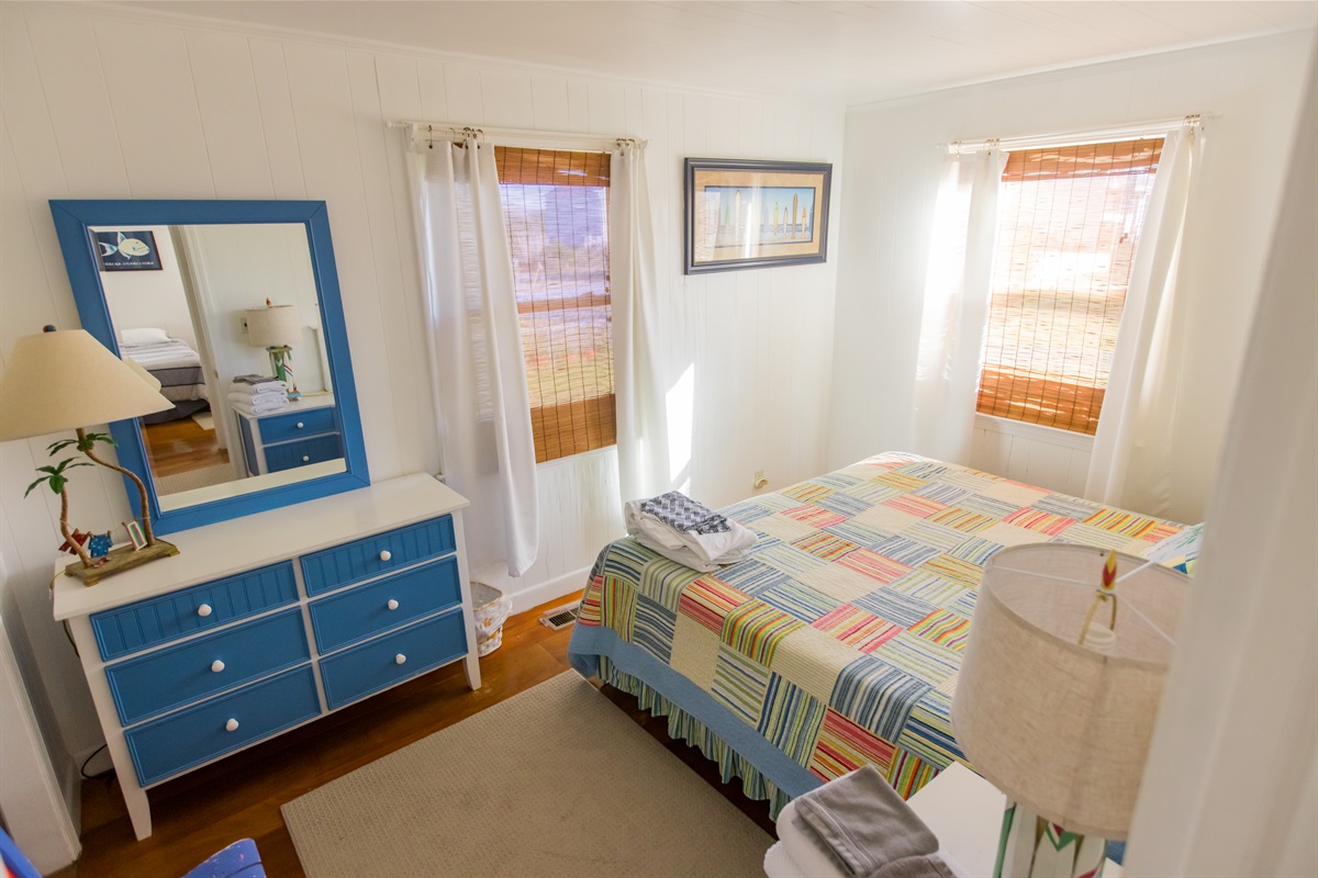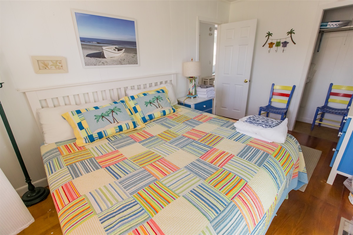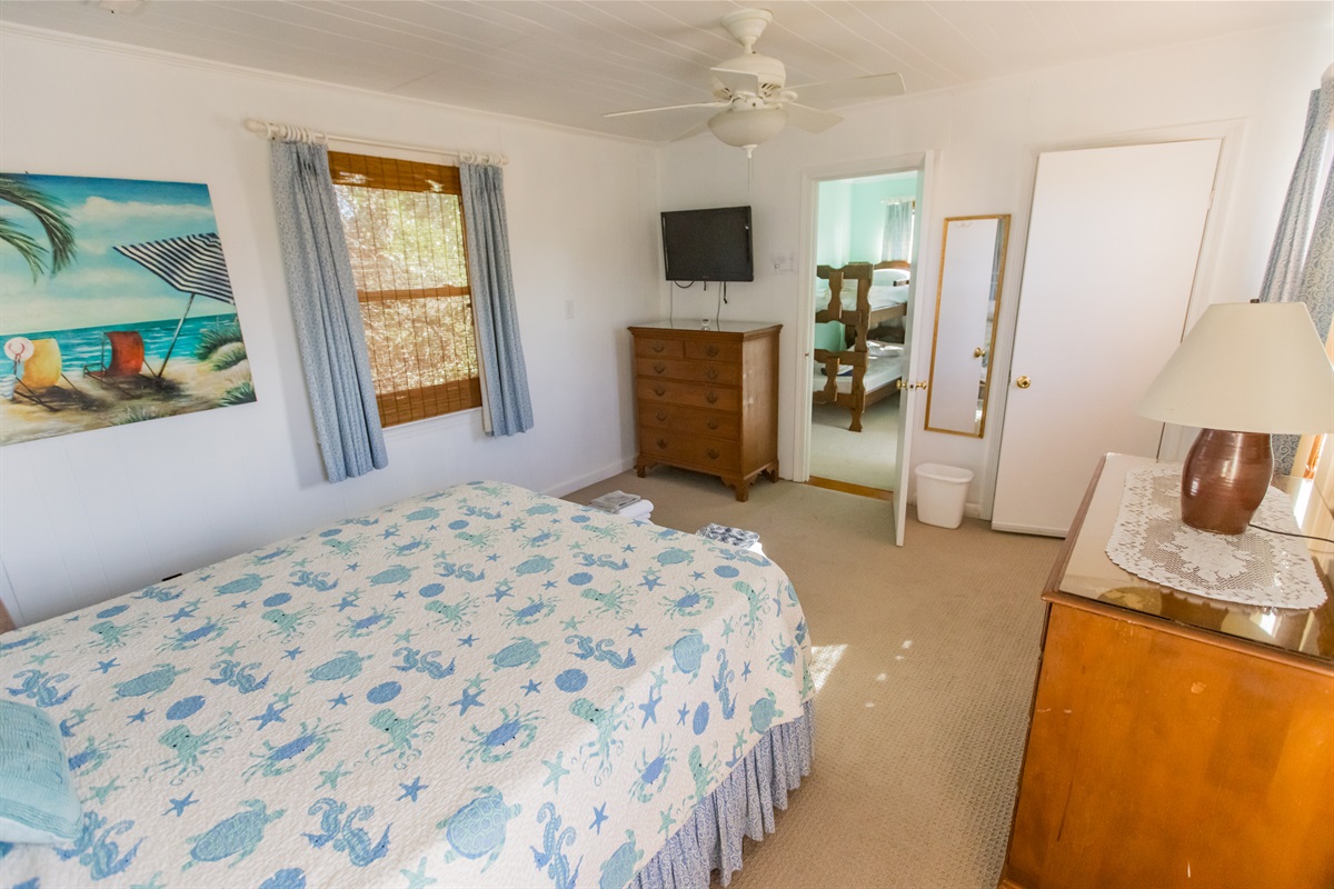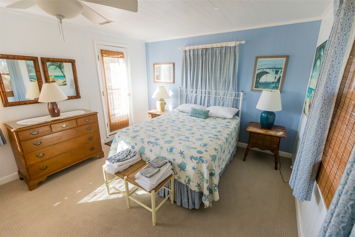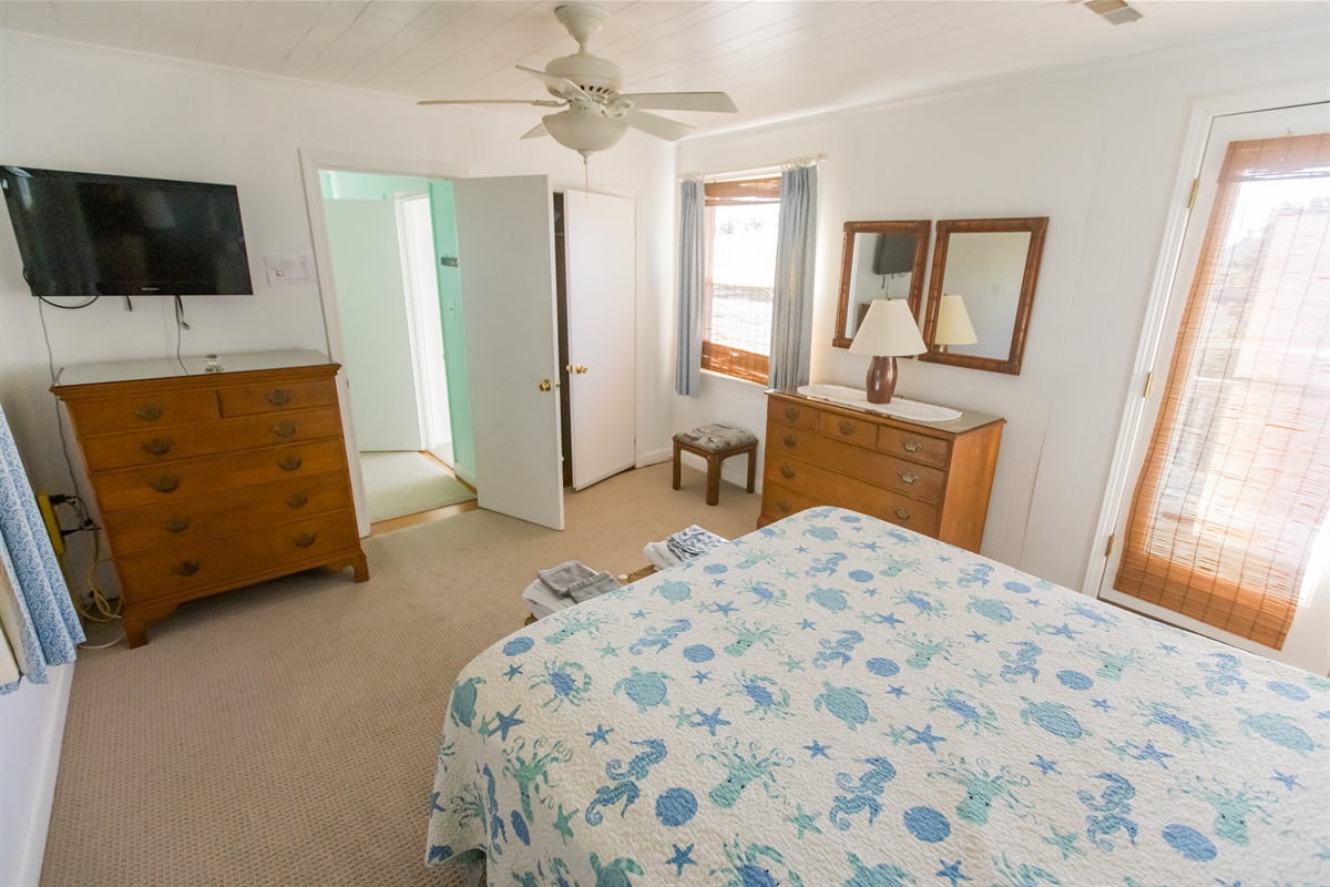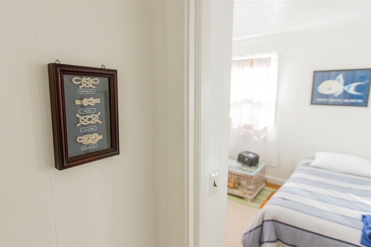 At the top of the stairs is the bunk room, which also provides access to the shared upstairs bathroom. From here, guests walk through to the spacious queen bedroom, which includes access to the upper deck—an ideal spot to enjoy morning coffee or evening breezes.