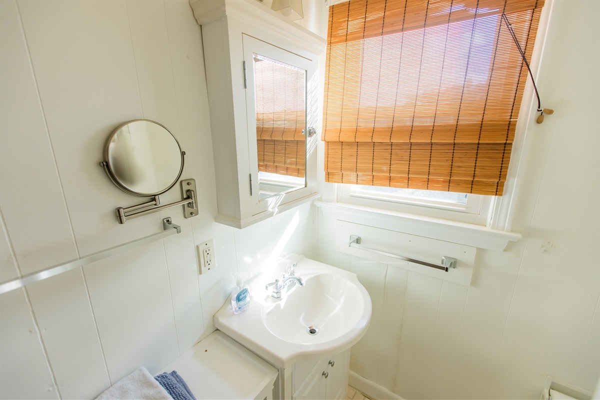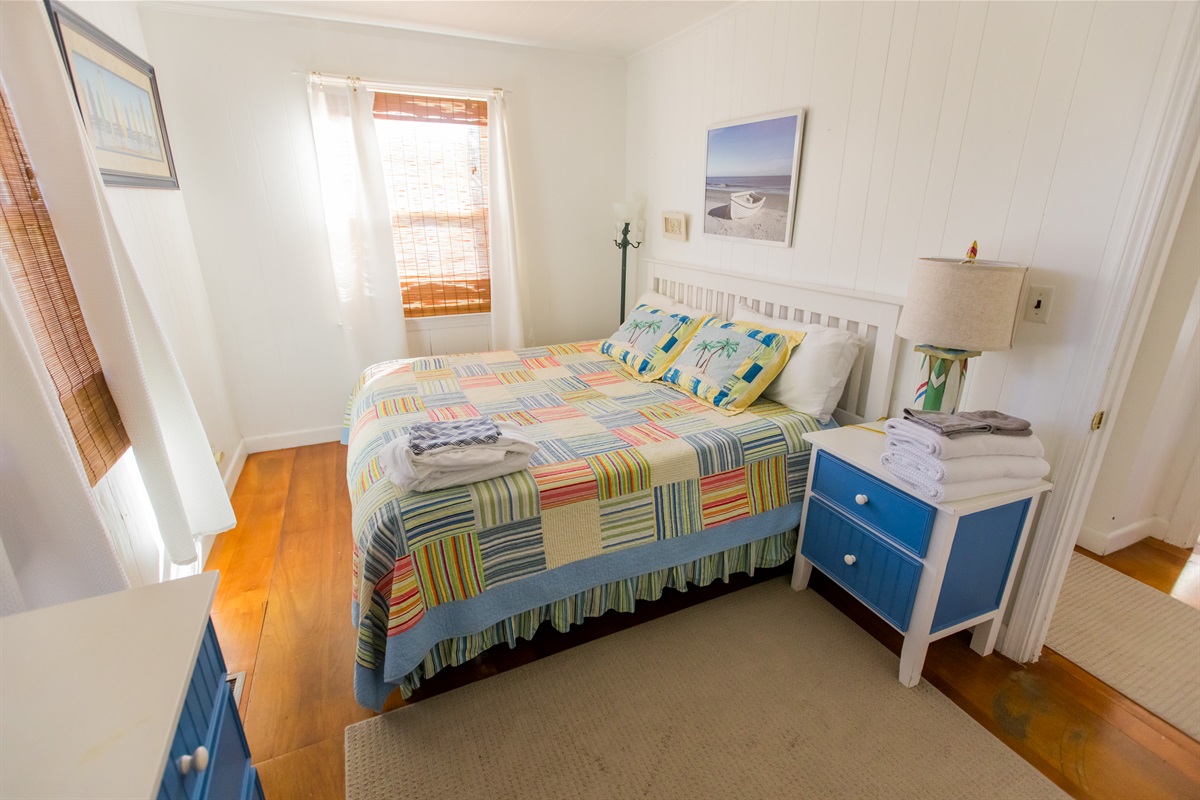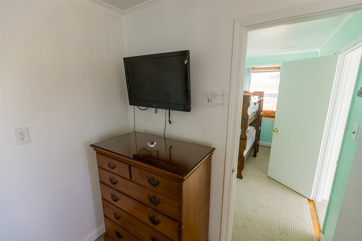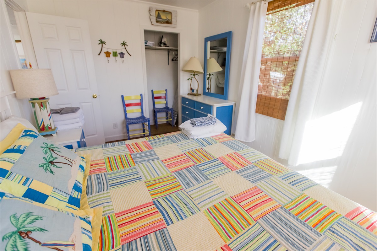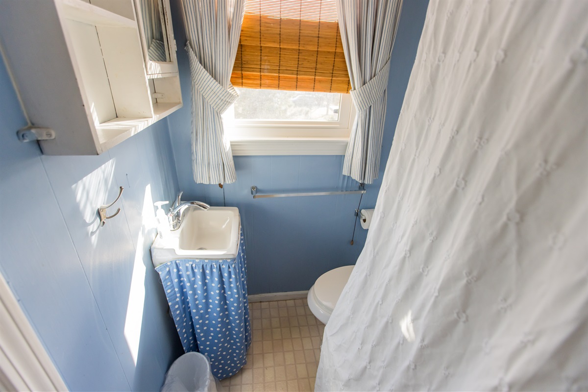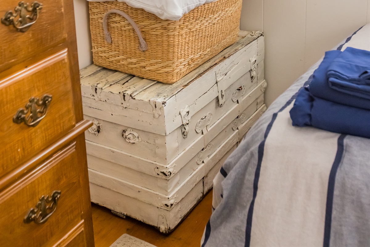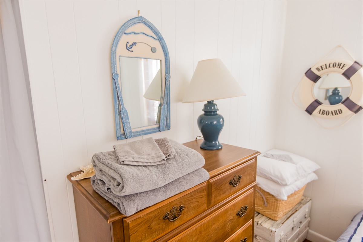 At the top of the stairs is the bunk room, which also provides access to the shared upstairs bathroom. From here, guests walk through to the spacious queen bedroom, which includes access to the upper deck—an ideal spot to enjoy morning coffee or evening breezes.