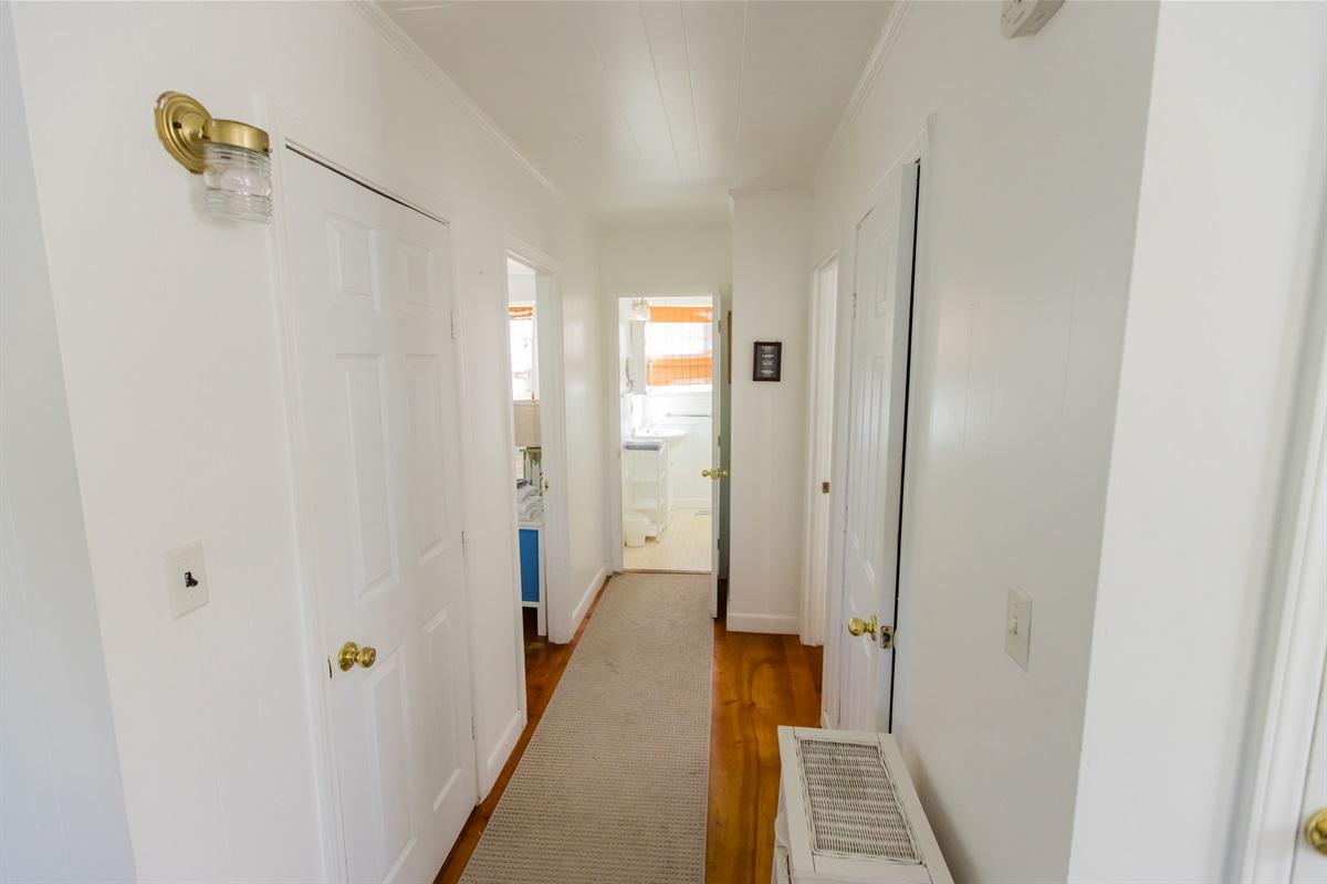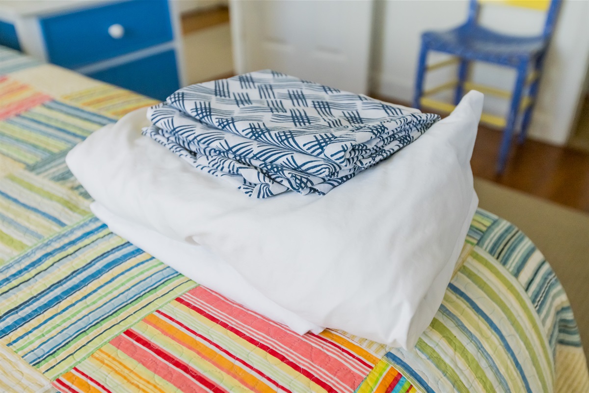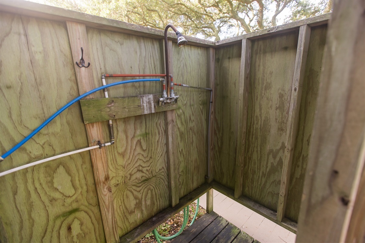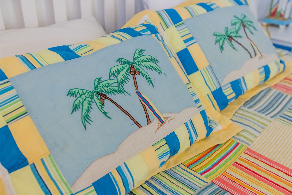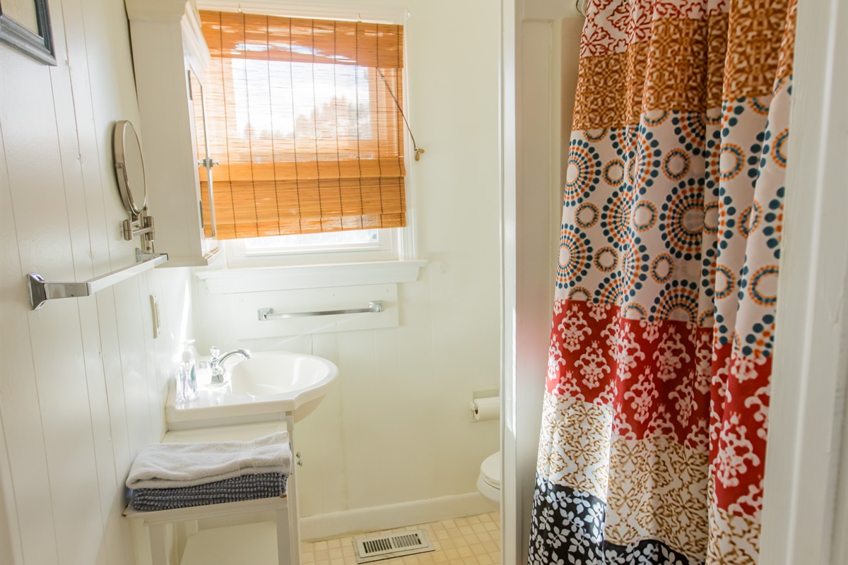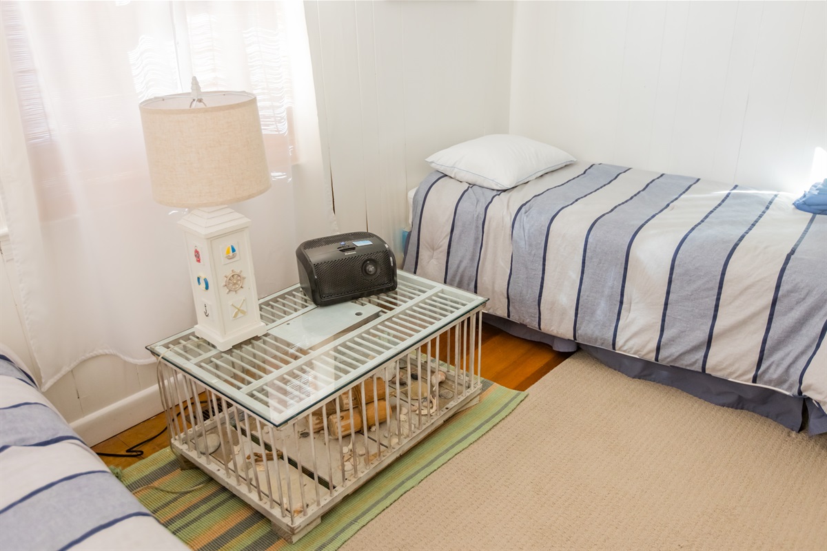 At the top of the stairs is the bunk room, which also provides access to the shared upstairs bathroom. From here, guests walk through to the spacious queen bedroom, which includes access to the upper deck—an ideal spot to enjoy morning coffee or evening breezes.