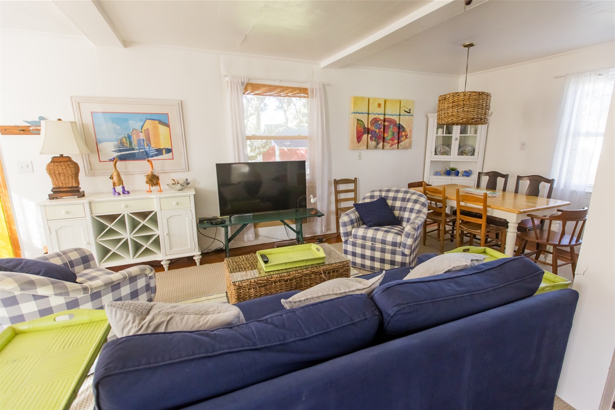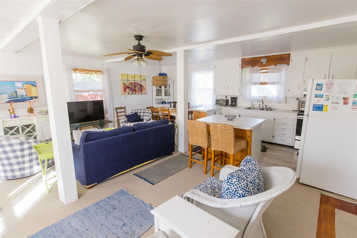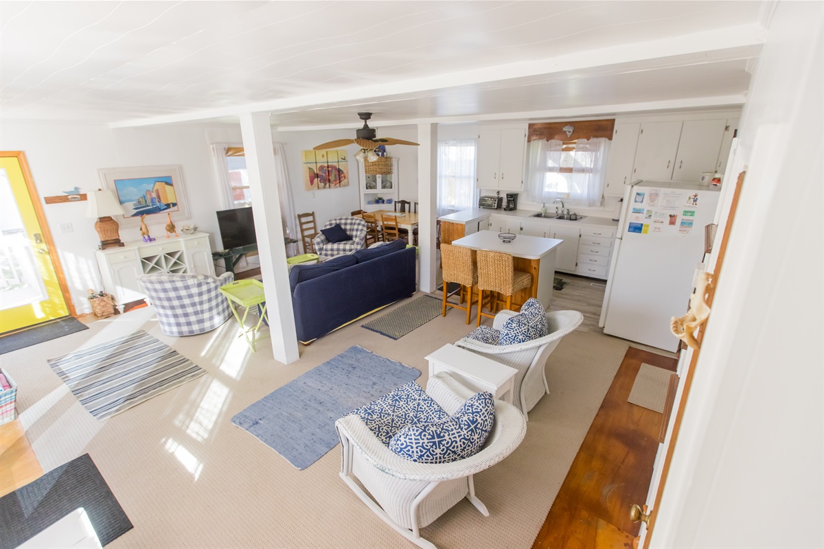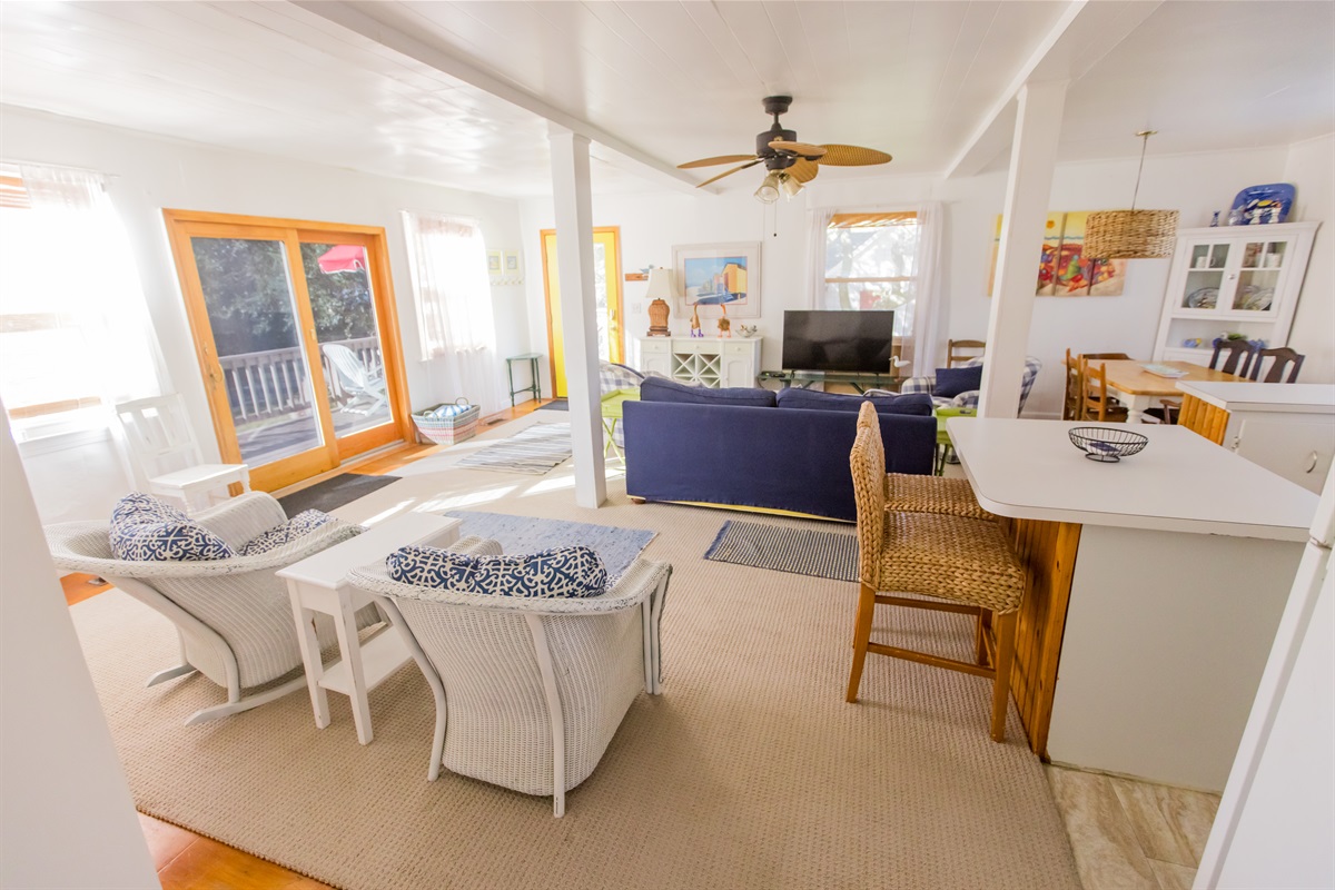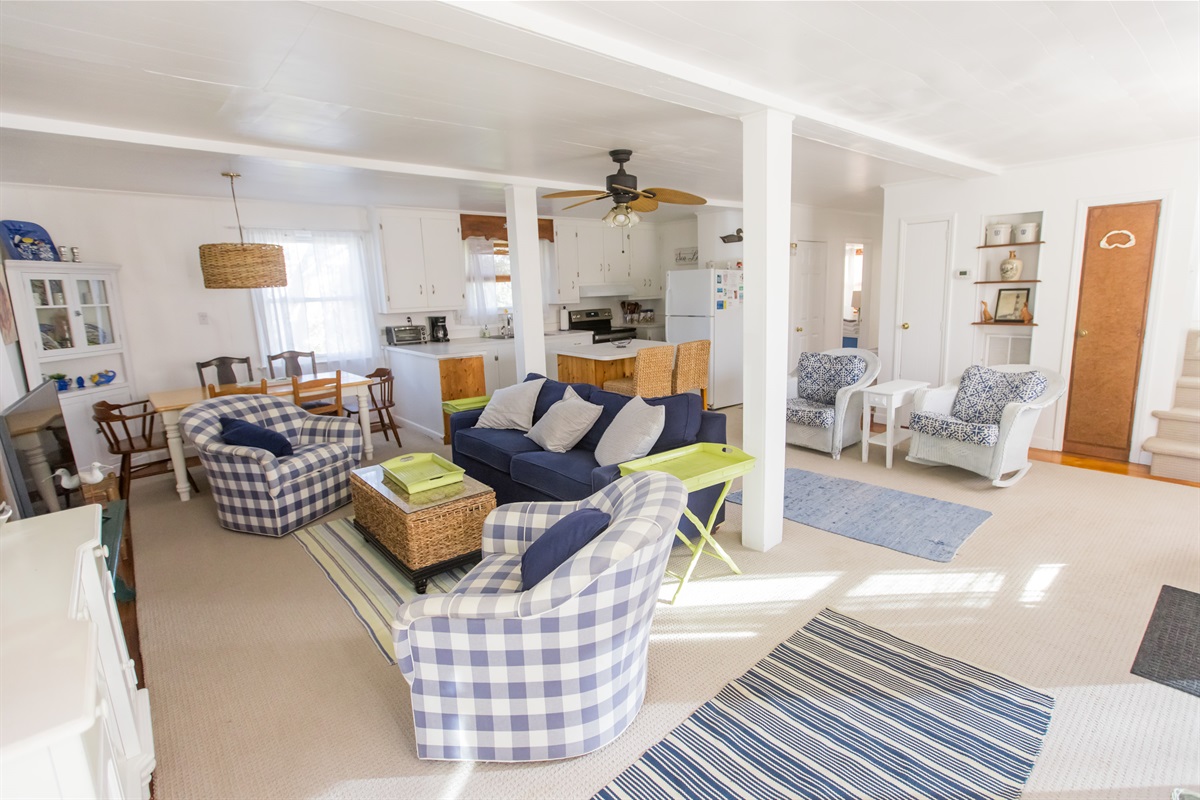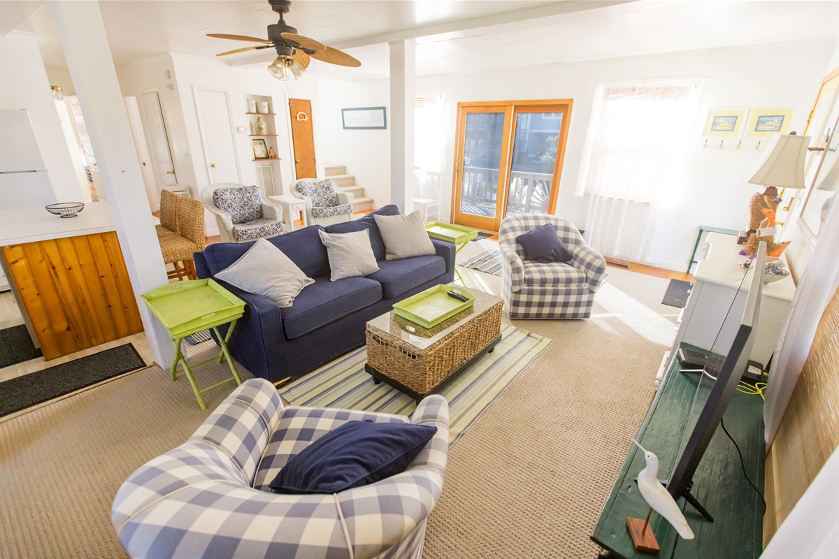 The main level features a welcoming great room with plenty of comfortable seating, a dining area, and a well-equipped kitchen—perfect for gathering after a day at the beach or exploring the town.