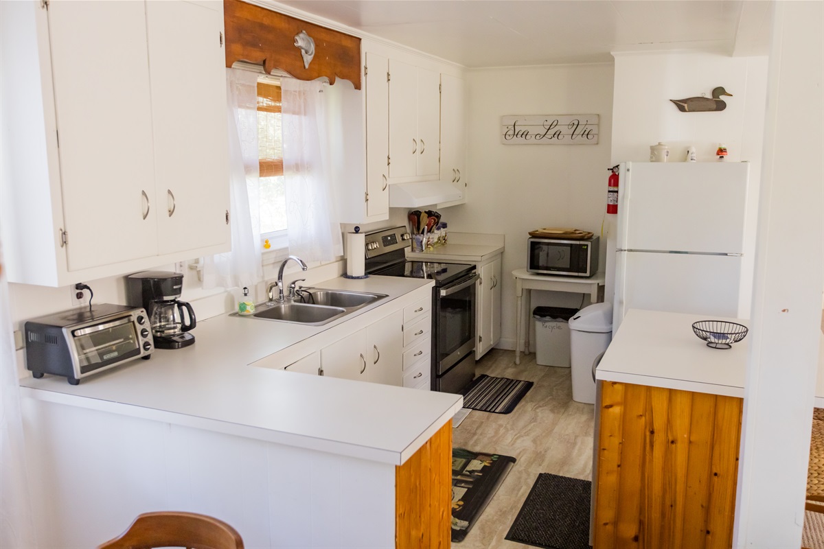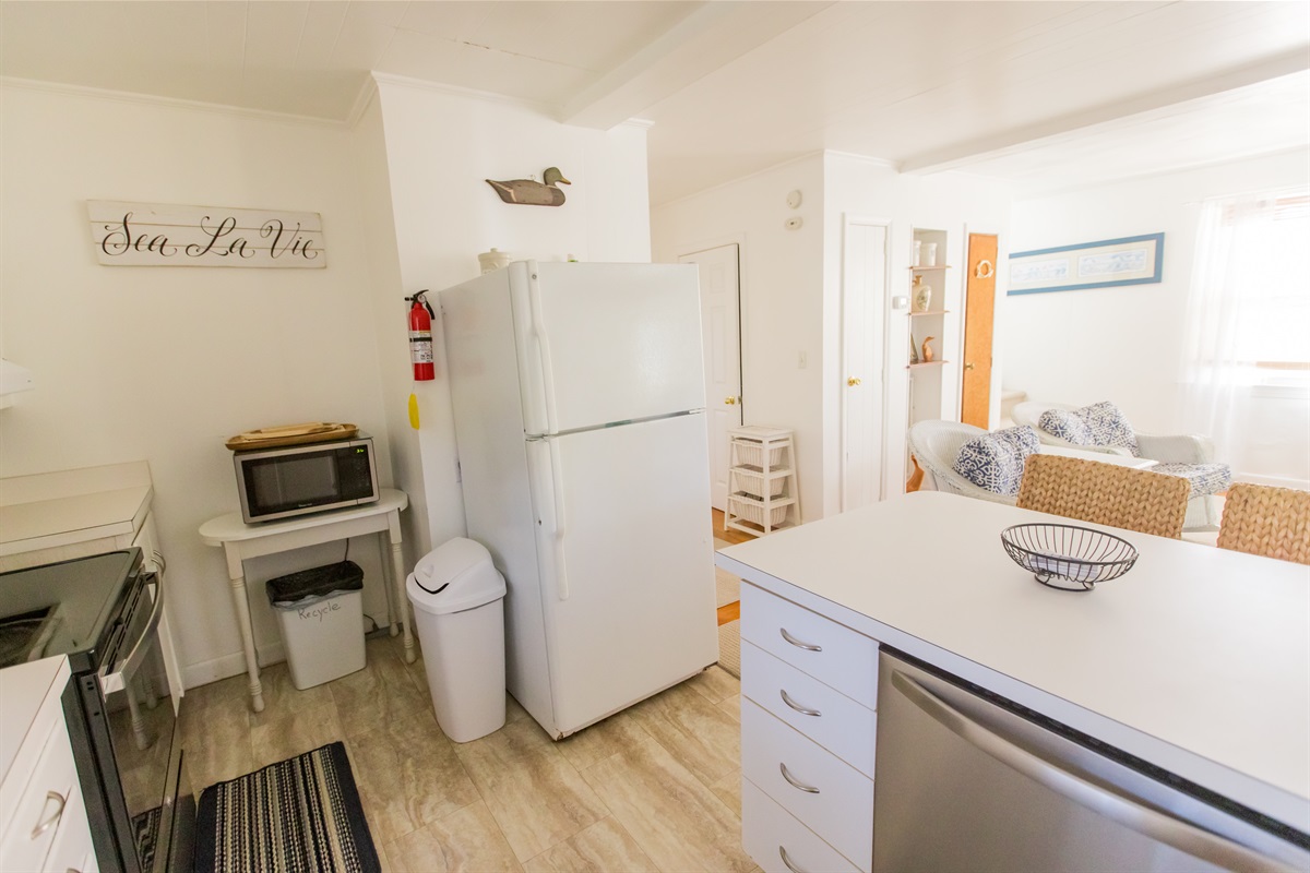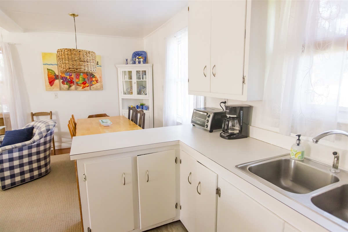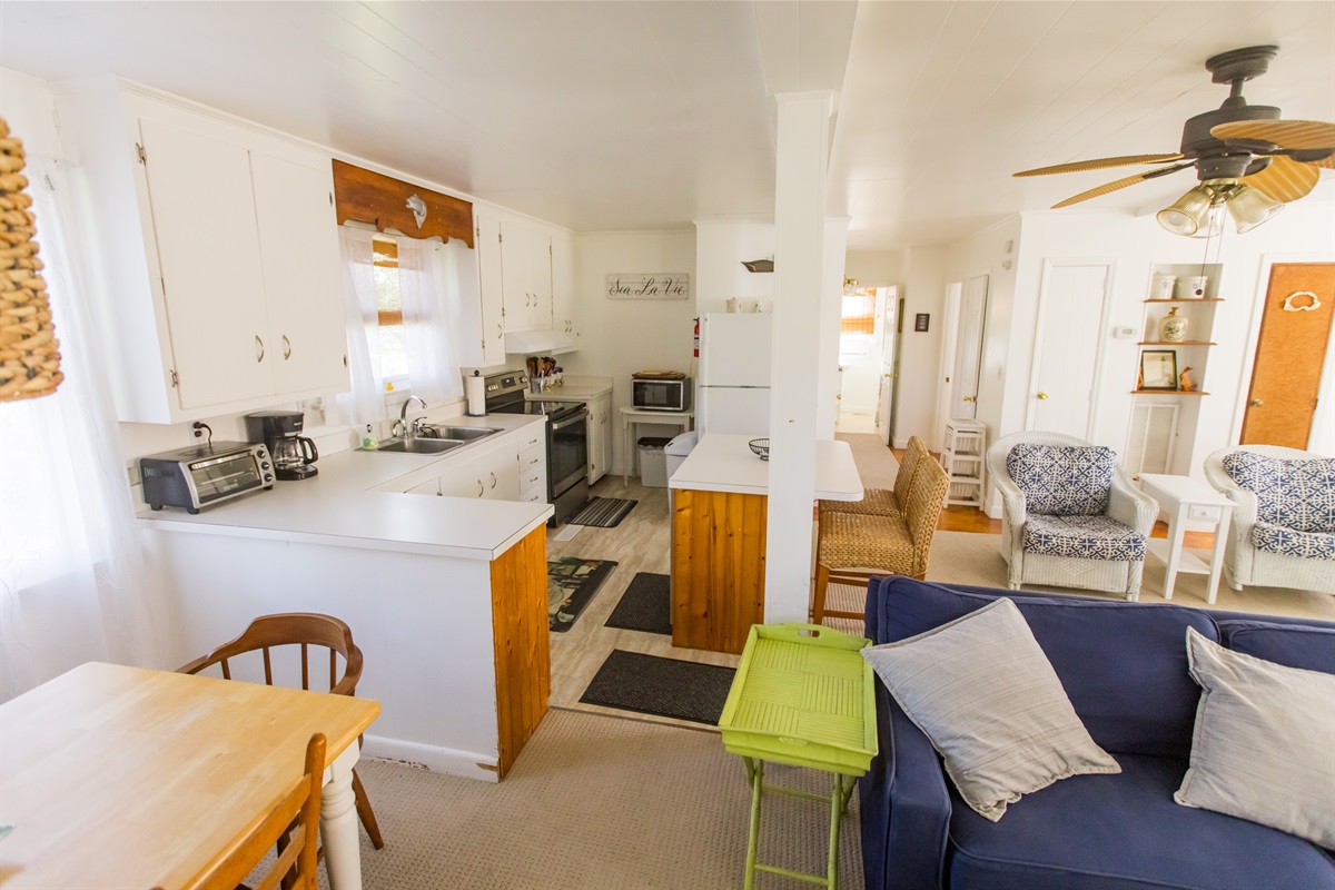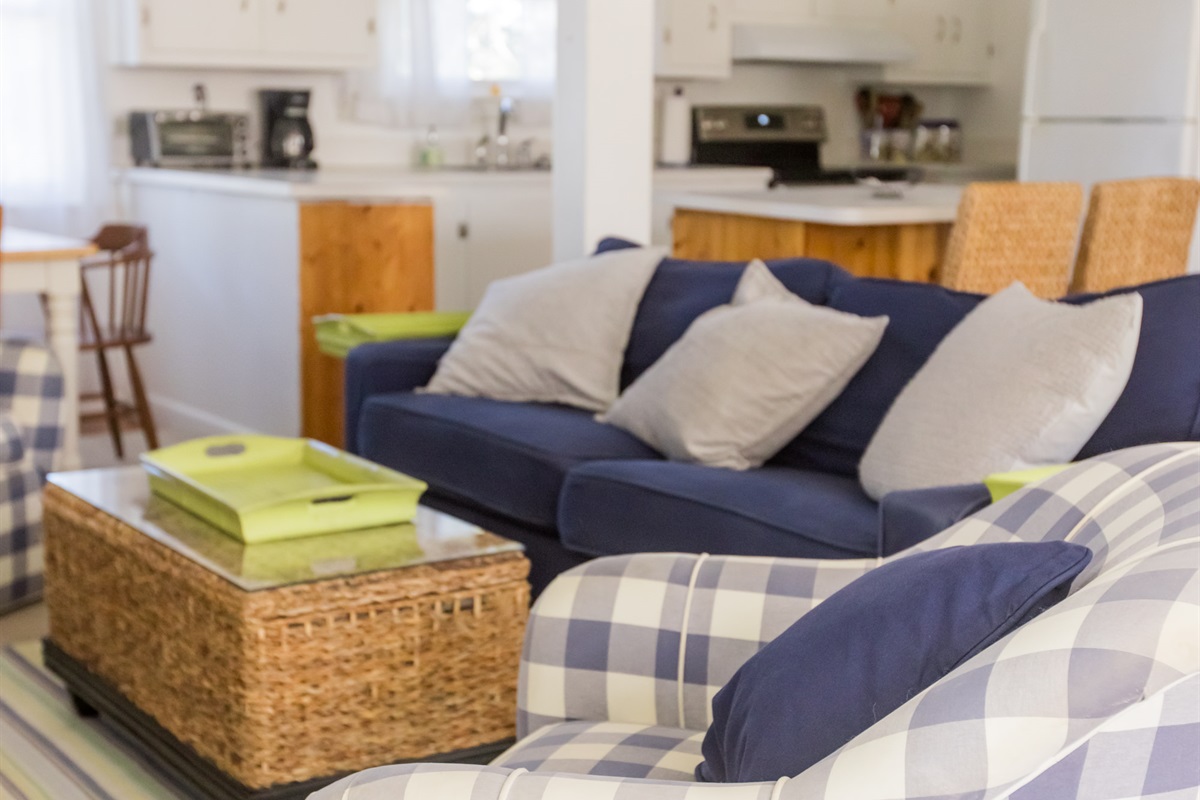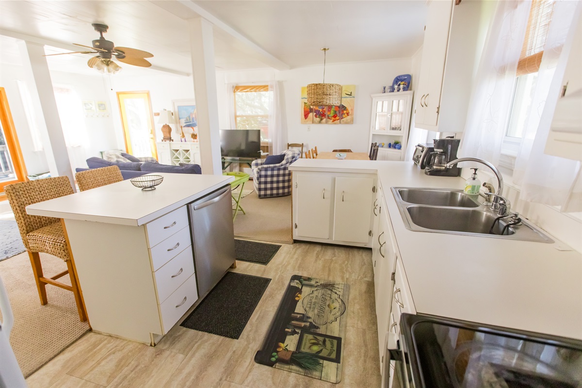 The main level features a welcoming great room with plenty of comfortable seating, a dining area, and a well-equipped kitchen—perfect for gathering after a day at the beach or exploring the town.